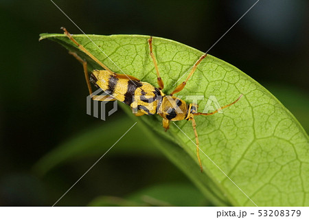 黒と黄色の派手なカラーリングの ヨツスジトラカミキリ虫の成虫(マクロレンズ・ストロボ+自然光)