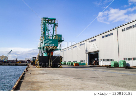 埠頭で作業するクローラークレーン