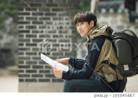 A young male college student who travels with a backpack looking at a map in Korea