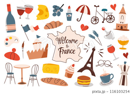 France symbols collection, welcome to france lettering, country map, Eiffel tower, croissant, cafe icons, vector illustrations of french flag and paris landmarks, travel in Europe simple cute doodles