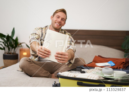 Portrait of smiling, handsome man, packing things in suitcase, showing his written list in notebook, going on holiday