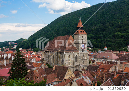 ルーマニア トランシルヴァニア地方のブラショフの黒の塔から見える旧市街の街並みと黒の教会とトゥンパ山