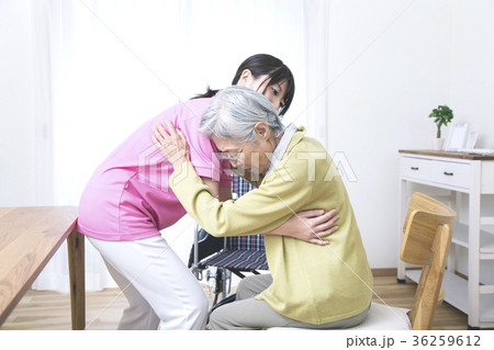 高齢女性の移乗介助をする女性介護士
