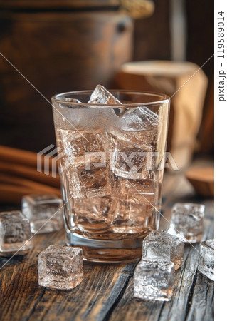 A glass filled with ice cubes on a wooden table illuminated by warm sunlight in the afternoon
