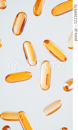Orange translucent gel pills levitating on a white background creating a visually appealing representation of healthcare, medicine, and pharmaceutical concepts