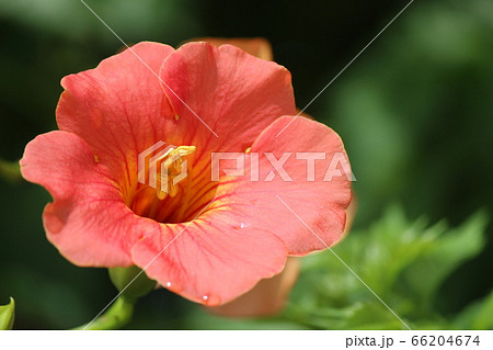 ノウゼンカズラの花のアップ【橙色花・緑背景】