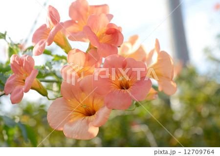 ノウゼンカズラのオレンジ色の花が咲いている夏の風景