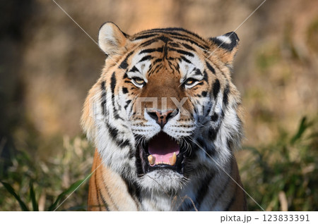 wild indian male bengal tiger or panthera tigris fine art closeup or portrait with eye contact in morning safari at bandhavgarh national park forest reserve madhya pradesh india asia