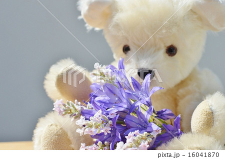 青紫色のトリテレイアと白色のサマースイートピーと小さなテディベア