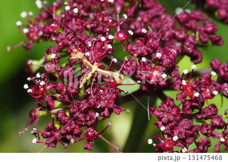 ヤブガラシの花の蜜を吸うシラホシトリバとそれを狙う小さな緑色の蜘蛛