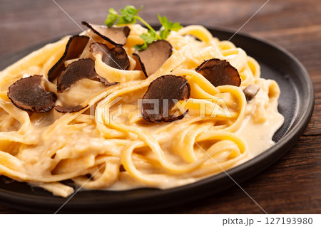 Tagliatelle Pasta with butter creamy white truffle sauce. Pasta with wild termite mushroom topped with truffle slice and watercress. Closeup italian food served on deep round plate. Top view