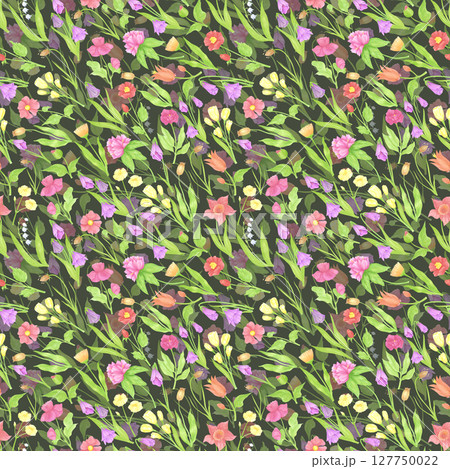 Hand drawn watercolor wildflowers field seamless pattern. Flower of the field isolated on dark background. Can be used for textile, fabric, scrapbook and other printed products.