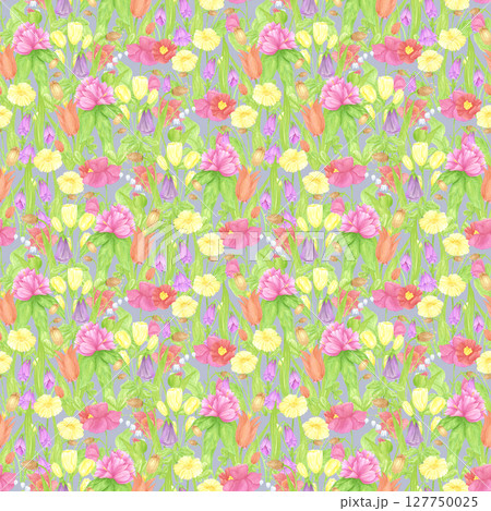 Hand drawn watercolor wildflowers field seamless pattern. Flower of the field isolated on grey background. Can be used for textile, fabric, scrapbook and other printed products.