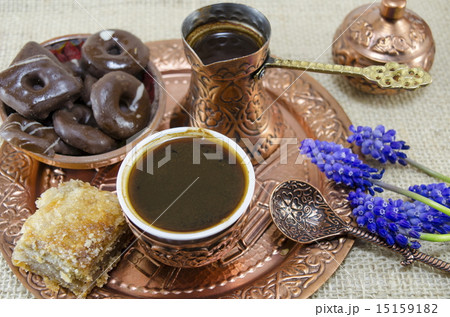 Turkish coffee with cookies and flowers