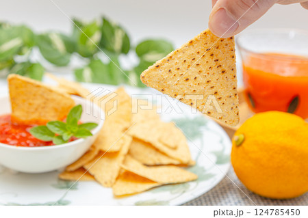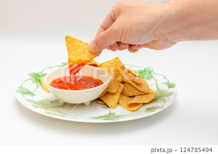 トルティーヤチップスとサルサソース チップスを手に持ってサルサソースにつけている