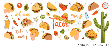 Tacos set. Tacos with meat, vegetable and tortilla. Traditional Mexican street fast food. Mexican cuisine restaurant food. Vector illustration