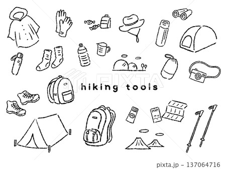 ハイキング道具の手描き風イラストセット