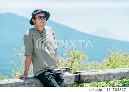 男性と夏の空と高原の風景・観光地・旅行・山・名所