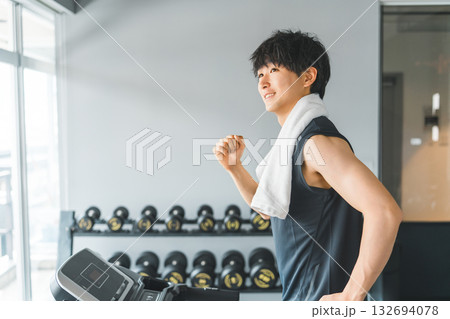 スポーツジムのウォーキングマシンで有酸素運動をする若いアジア人男性(ジョギング)