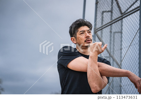 屋外で準備運動をする男性