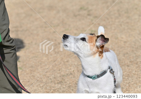 女性と散歩するジャックラッセルテリア