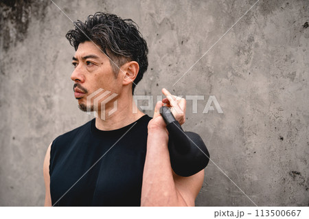 屋外で筋トレをする40代男性