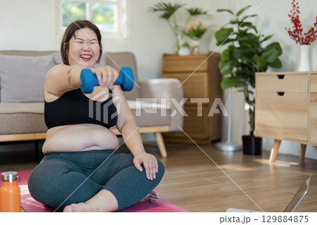 Happy Overweight Woman Exercising at Home with Dumbbells on Yoga Mat in Cozy Living Room Setting
