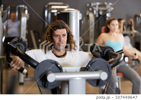 Portrait of athletic man during workout with power exercise machine in gym