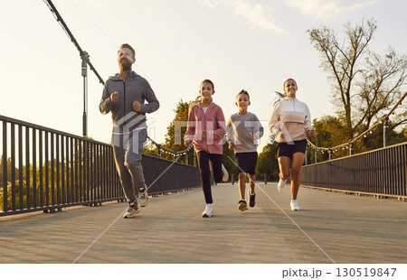 Happy active family in sportswear running together in the park having sport workout outdoors.