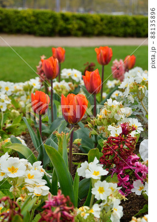 フランス・パリ、トロカデロ庭園に咲いているチューリップ、2021年4月14日撮影。