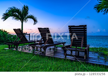 海辺のリゾートチェアで過ごす石垣島の夕暮れ時