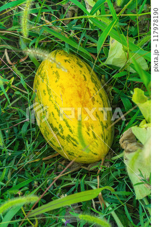A yellow-green ripe fruit of an oblong variety of melon lies among a carpet of weeds and is waiting for a new autumn harvest of the coming gardening season to be harvested