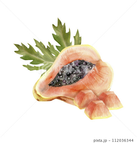 Tropical orange papaya with green leaves illustration. Exotic fruits composition with half papaya and small pieces for packing, label, logo, cocktails decoration.