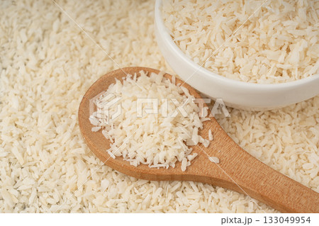 Grated coconut powder. Dry coco flakes pile, shredded desiccated coconut, tropical fruit chips
