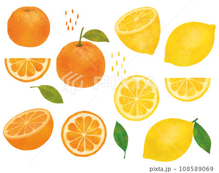 オレンジ、レモンのイラスト(みかん、柑橘類、輪切り、カット、水彩、手書き)