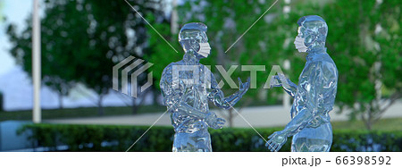 屋外で打ち合わせをする マスクを着けたガラスの人間