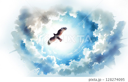 空を飛ぶトンビ(鳶) 水彩画タッチ