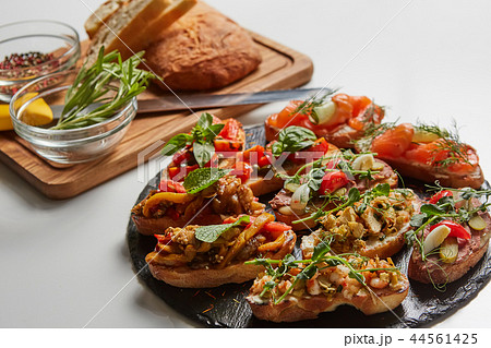 Set of assorted bruschetta with various toppings for holiday. Top view. Party food concept.