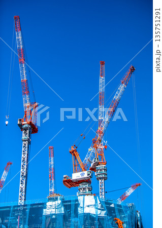 日本の東京都市景観新風景。TOKYO TORCH 大手町に巨大鉄骨構造体やクレーン群。未来へ