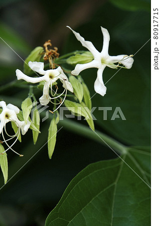 夏の雨に濡れて咲く雑木の白い花のクサギ