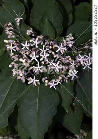 暑い夏、次々と紫と白の花を咲かせる、クサギ