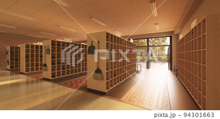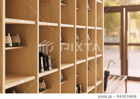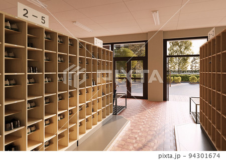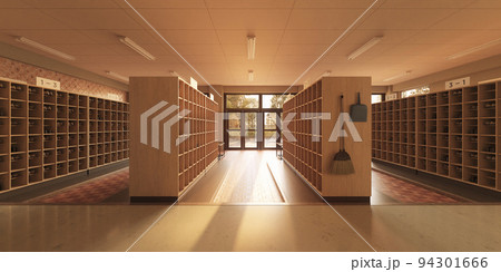 放課後の昇降口・夕日に照らされた下駄箱と靴 / 学園ロケーション・青春とノスタルジーのイメージ