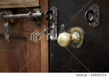 レトロな木の扉と真鍮のドアノブ