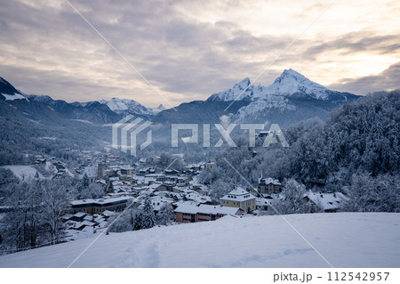 ドイツ 冬のベルヒテスガーデンの街並み 聳えるヴァッツマン山