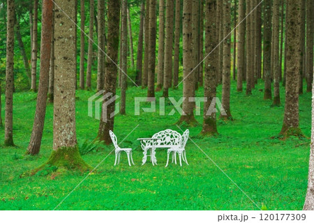 開田高原 ドイツトウヒの森にある白いテーブルとイス