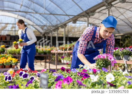 Friendly guy seller helps a girl buyer choose a fresh greenery