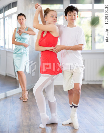Couple of teenagers in evening dresses are learning to dance an polonaise dance