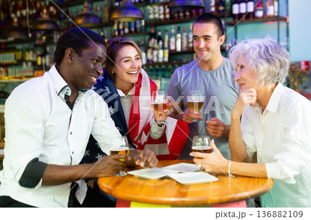 Happy friends drinking beer after solving their financial problems while sitting together at home cooking table