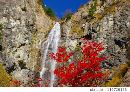 赤く色づいた紅葉を前景に断崖絶壁を流れ落ちるふくべの大滝 Ver6