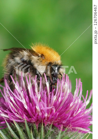 Vertical closeup on a brown banded common bumblebee , Bombus pascuorum sitting a purple thistle flower